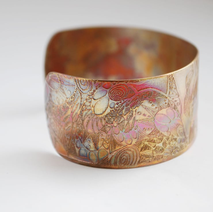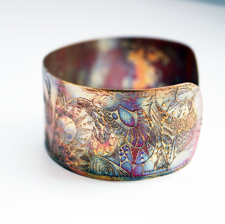 This etched copper bangle bearing imagery of flying barn owls has been heat treated to create a vibrant multicoloured patina: this will deepen over time. I have developed a technique of literally 'painting' with a flame to manipulate the shape and direction of the colours. Although there is a degree of control, each piece is unique, as the colour patina cannot be replicated exactly.