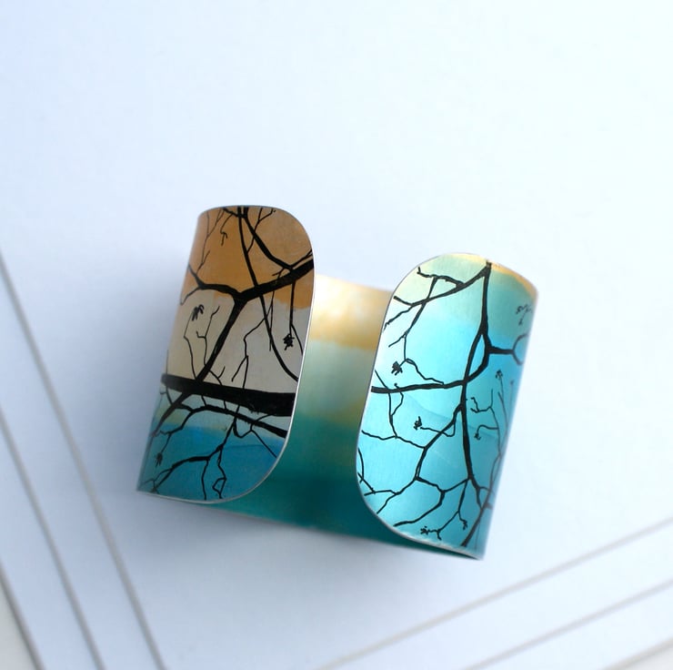 Gorgeous cuff in shades of turquoise and gold with a black silhouette.