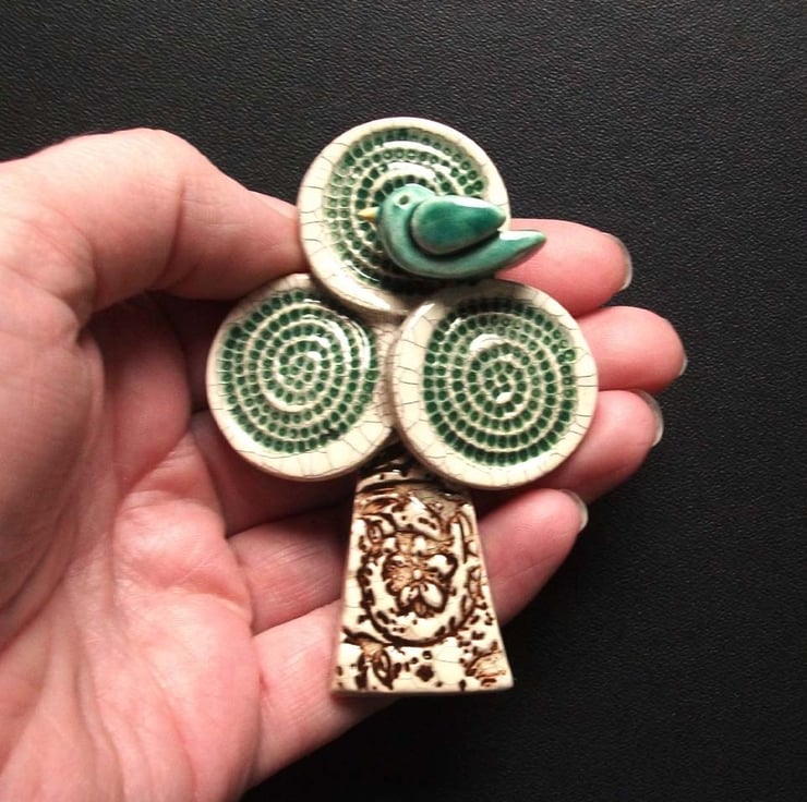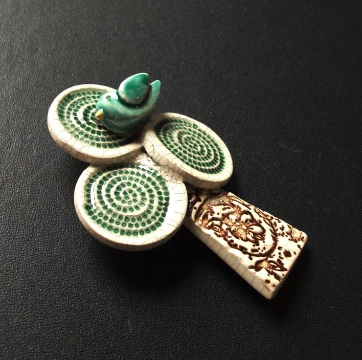 This cute little bird perches atop a swirly tree. It is hand-cut from white earthenware clay, coloured and fired. It has then been given a coat of crackle glaze and fired again to a top temperature of 1100 degrees, so it is nice and strong.
