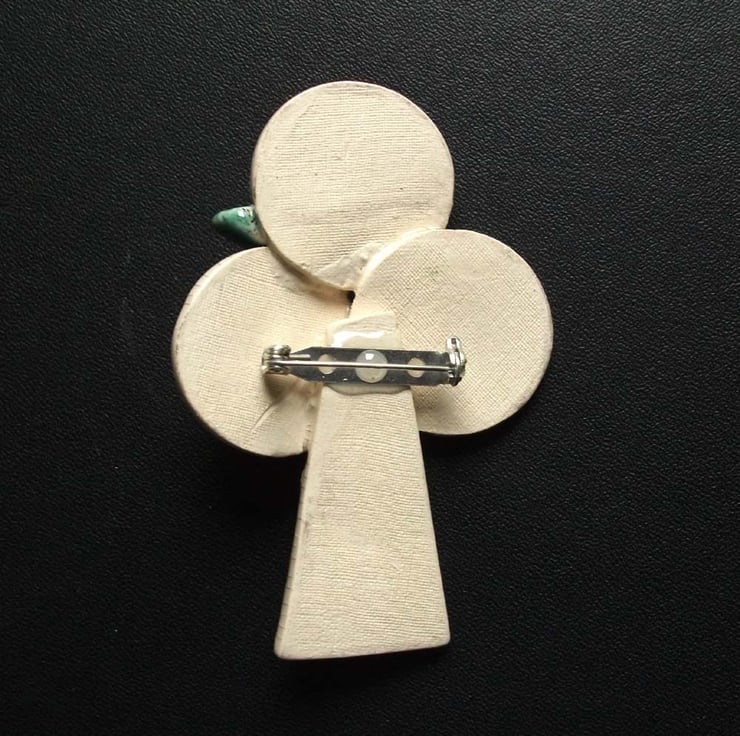 It measures 8cm long, 5cm wide and 2cm deep and fastens with a silver plated brooch back.