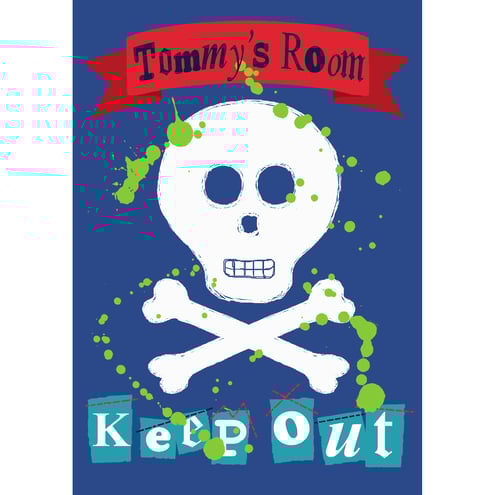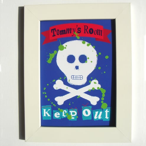 This boys pirate theme personalised picture is an original, framed print designed to go on a child's door. They look great on bedroom walls too though! Boys love the skull and cross bones design and the 'Keep Out' message!