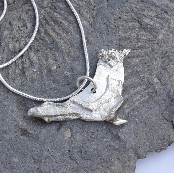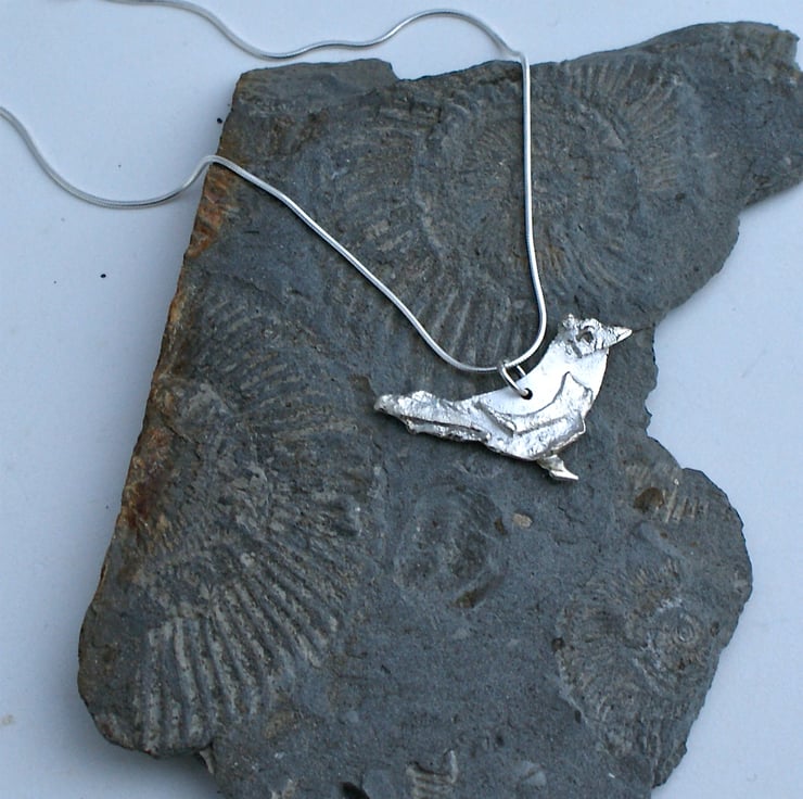 A cute textured bird pendant made from pieces of silver fused together and hung from a silver snake chain.