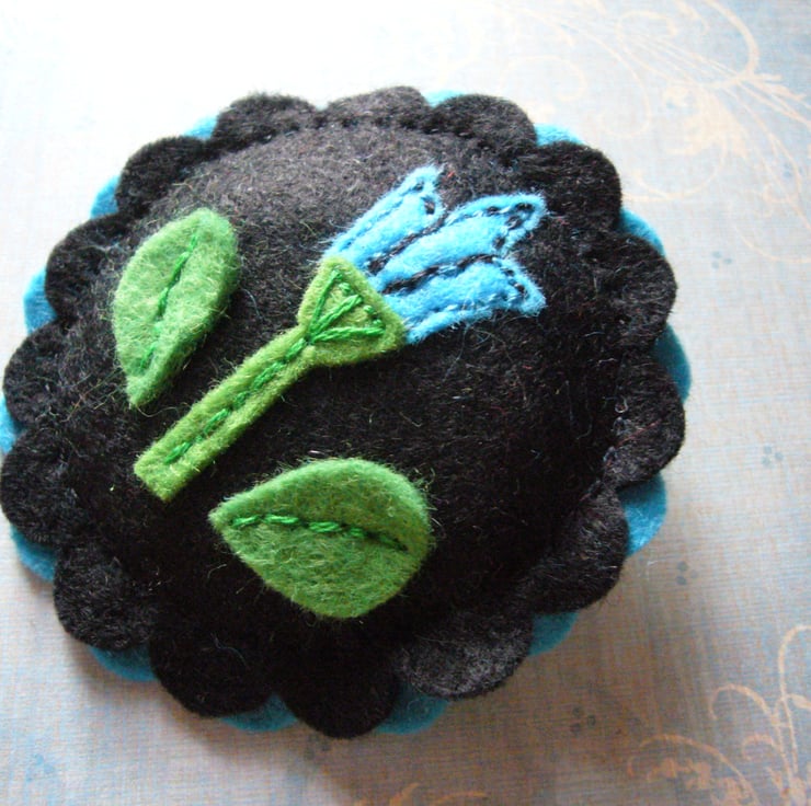 A bright symmetrical Turquoise flower decorates this brooch. It is completely and carefully handstitched - the stitches holding the flowers and leaves in place are visible