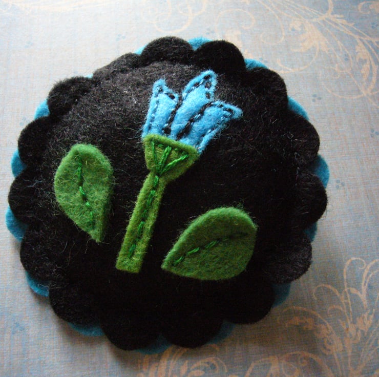 A bright symmetrical Turquoise flower decorates this brooch. It is completely and carefully handstitched - the stitches holding the flowers and leaves in place are visible