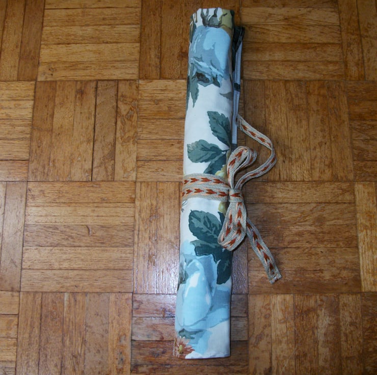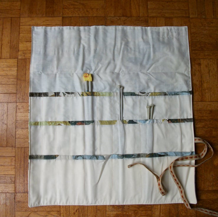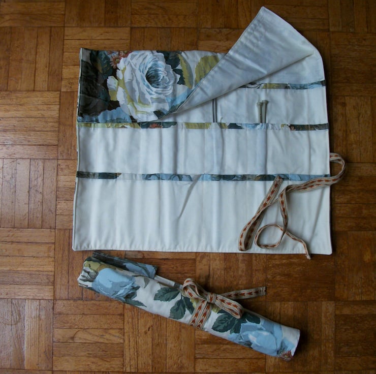 The top of the case is a flap which folds over to keep the needles safe. Once rolled up, there is a brown and beige patterned ribbon tie to secure the holder. It is top stitched to achieve a professional finish. Total size when placed out flat is 17.5" x 19".