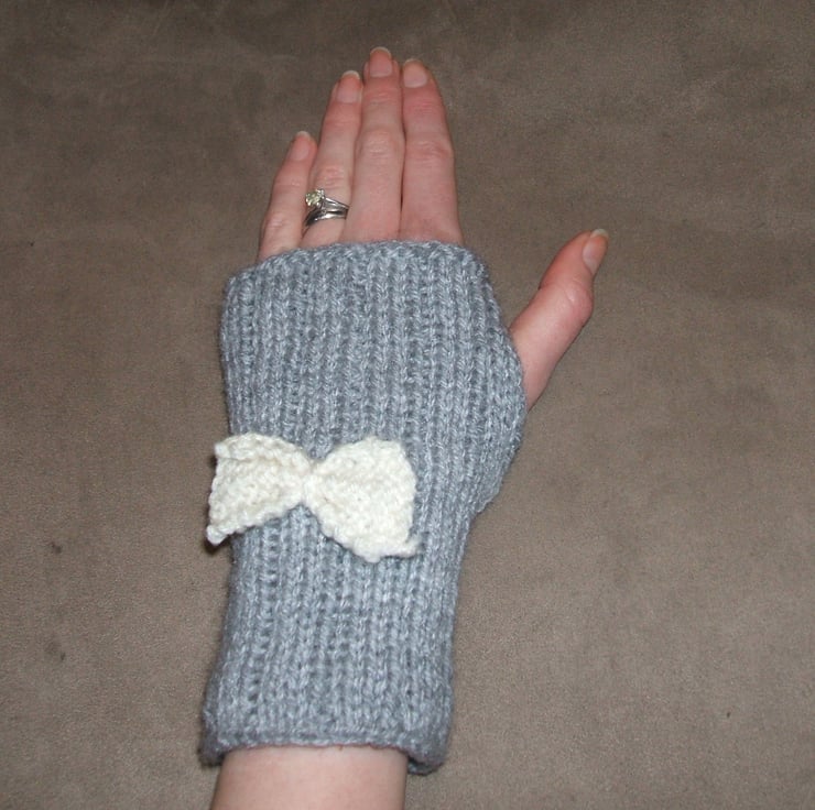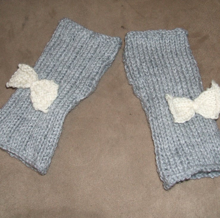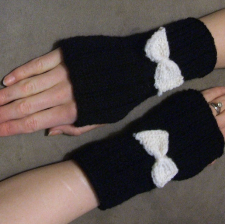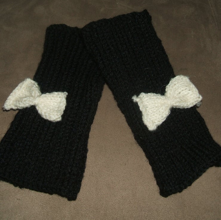 Cute knitted arm warmers, decorated with a little knited bow. Grey or black with an off-white bow. Ribbed all the way along for a snug fit, and with a suitably placed hole for your thumb to poke out :)