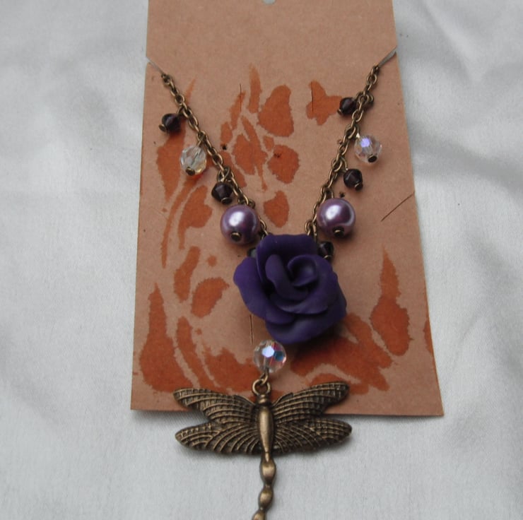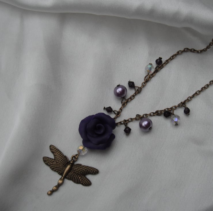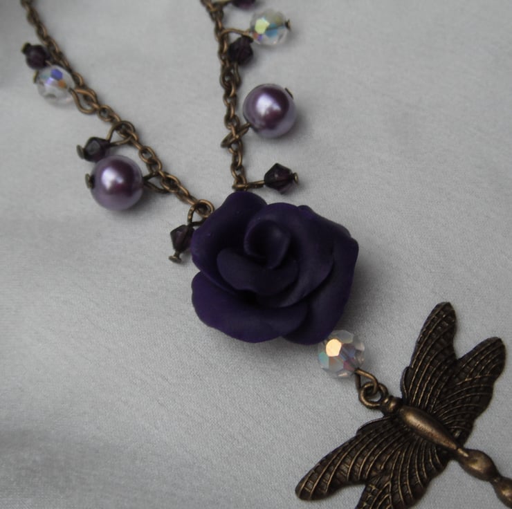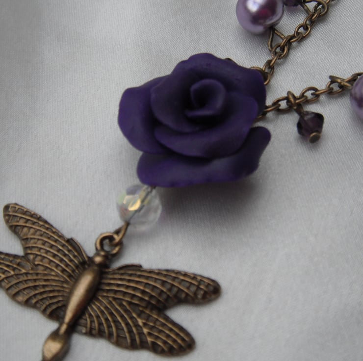 This lovely necklace is adorned with 4mm purple bicone beads, 8mm dusky pink Czech glass pearls, 6mm AB crystal beads, and a focal comprising of a hand-made (by me!) purple fimo rose, and a 35mm x 35mm dragonfly charm.