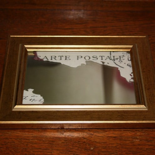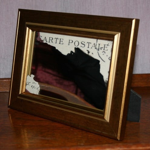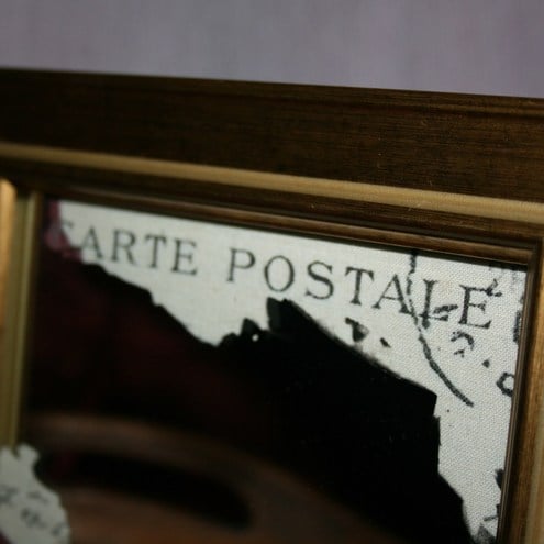 I have decorated the mirror by giving it a distressed look.I have removed some of the silvering from the back and added my own printed fabric behind it.The fabric shows text from an old french postcard from 1906.