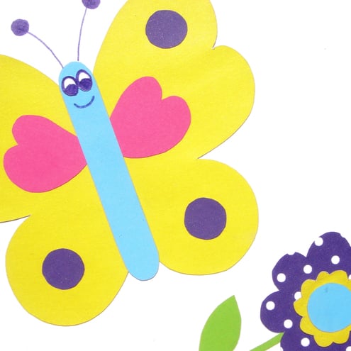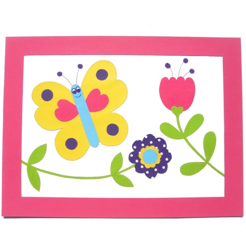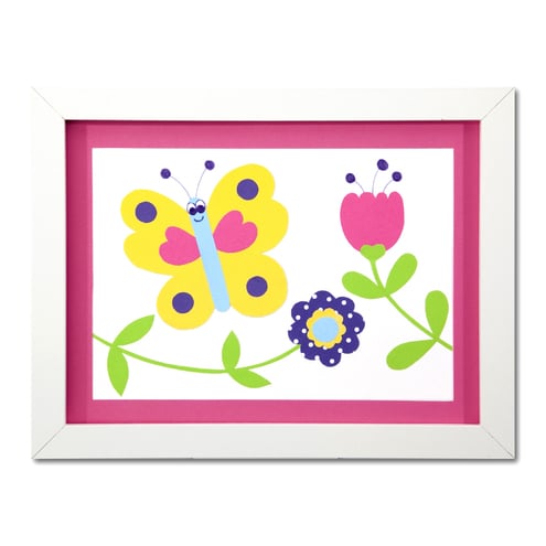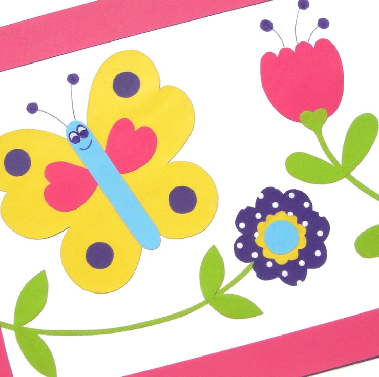This pretty butterfly picture is made up of bright collaged paper, all carefully hand cut and mounted onto thick card, then finished with a complimentary pink mount and framed.
