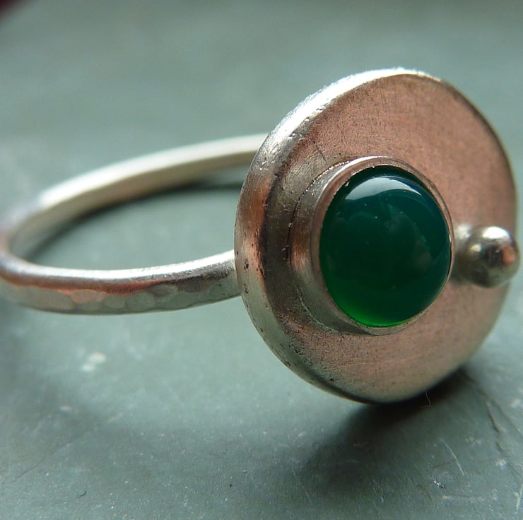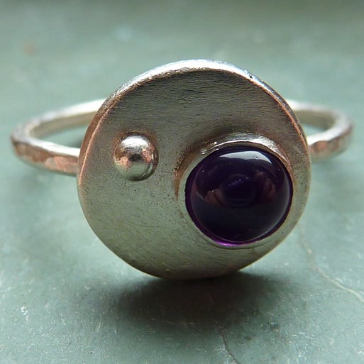 A really beautiful little ring. A semi precious 5mm gemstone (of your choice) is asymmetrically set on a round base and offset with a tiny silver ball. The surface of the round base has a brushed satin finish and the ring band can be hammered or left plain.