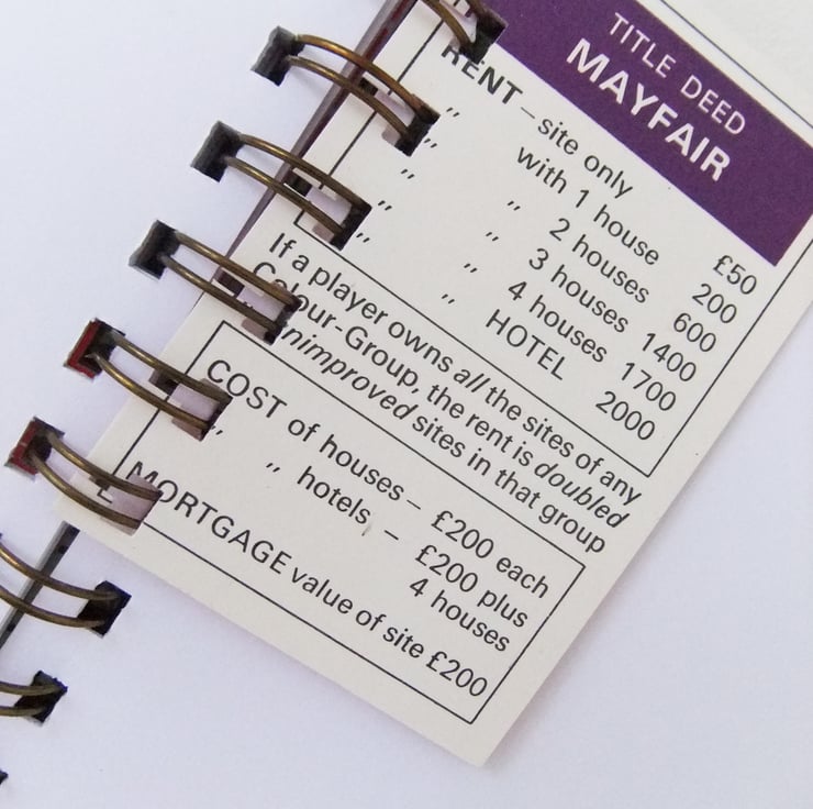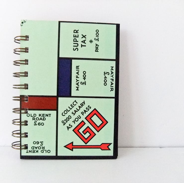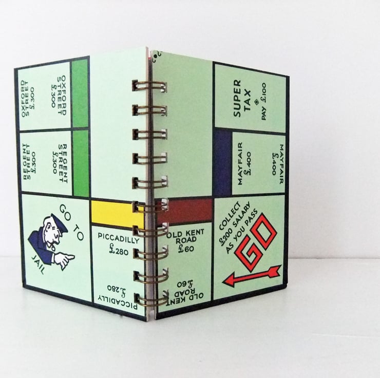 This is a great size of notebook for carrying in a bag or pocket. It has been made from a vintage Monopoly game. The covers are from the Monopoly game board and 3 of the property cards from the game have been used as moveable dividers inside the notebook.