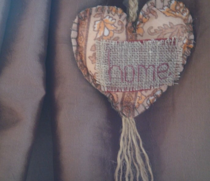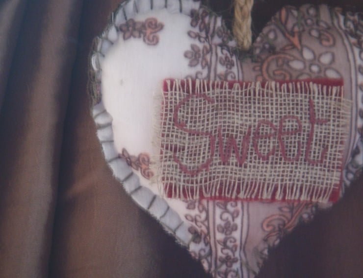 Each heart is adorned with embroidered scrim which in sequence spell out ‘Home Sweet Home’, and which are securely fastened to the heart via felt and UHU.