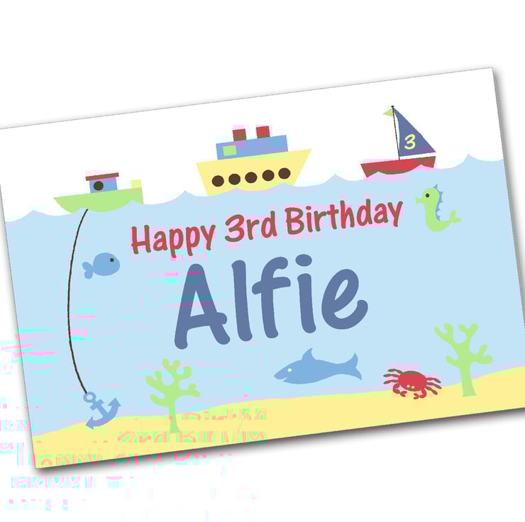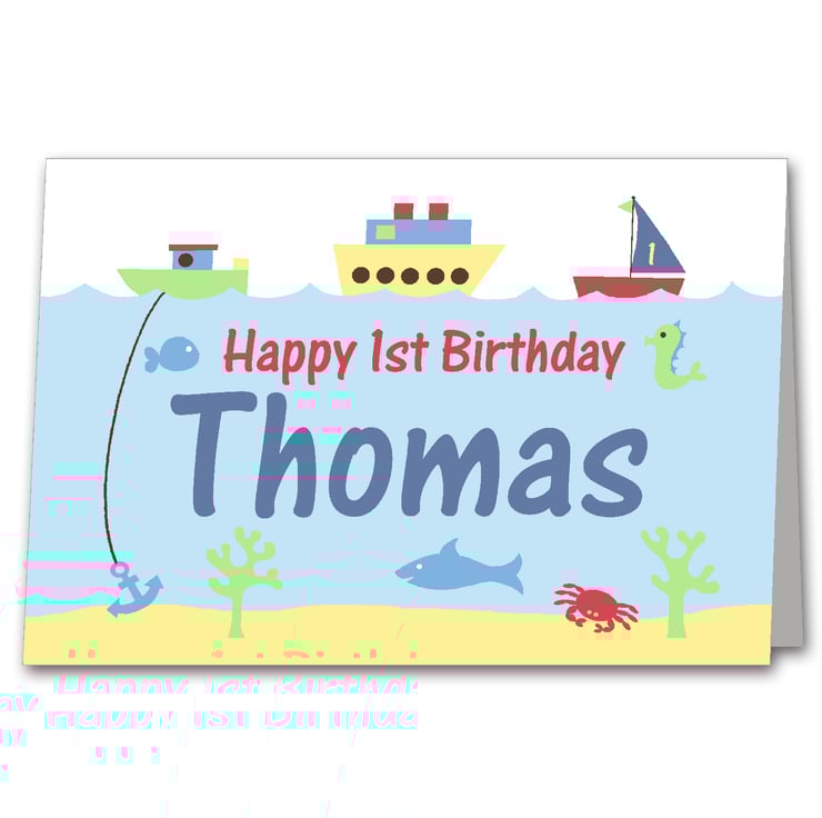 This lovely childrens birthday card features the name of the recipient under the sea with boats bobbing around up above and cute sea creatures swimming around.
