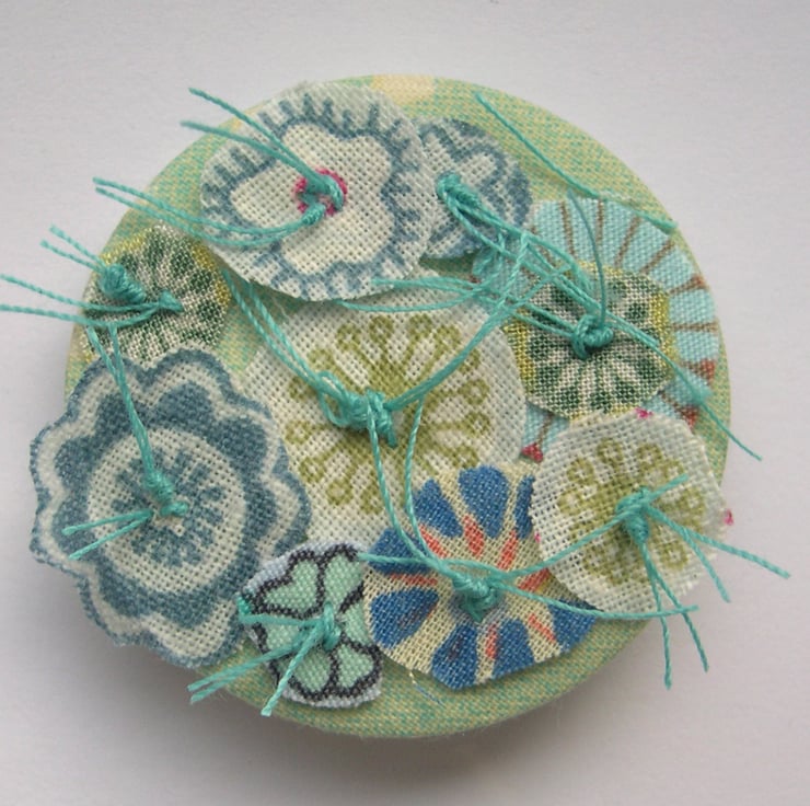 The pieces are created with reclaimed textiles and are entirely crafted by hand - hand stitched, hand cut and hand pressed onto a pin fastener.