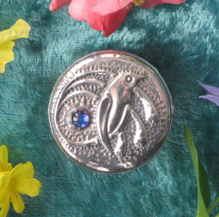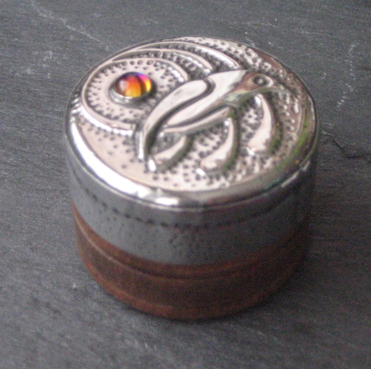 This little rustic wooden box has been transformed with a lid of hand-crafted pewter featuring a pretty blue glass cabochon which changes colour with the direction of the light. The box measures 39mm (1.5ins) across and is 30mm(1.25ins) high.