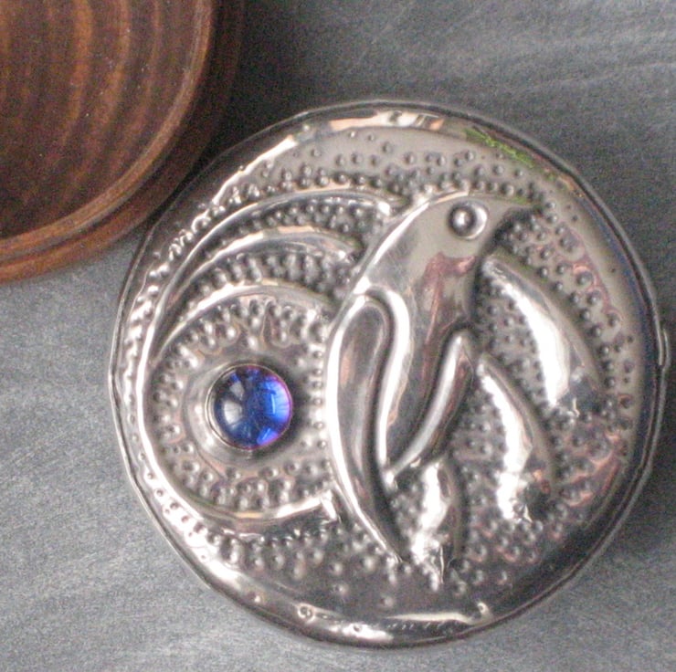 Each pewter piece has been individually made by hand (not cast) to my own design. A pattern is raised on a sheet of pewter, then the raised area is filled. The item is then mounted on a rigid base,chemically patinated, then polished.Modern pewter is lead-free and after patination has a shiny,almost reflective,finish.It does not blacken like silver and can be brightened, if necessary,with a smear of metal polish and a buffing with a soft cloth.