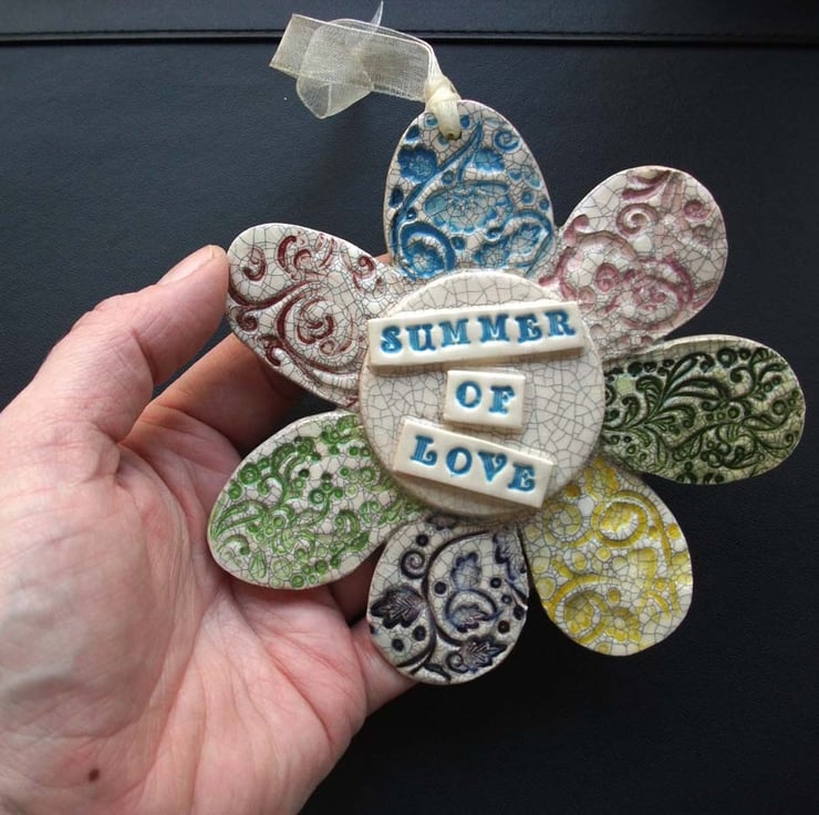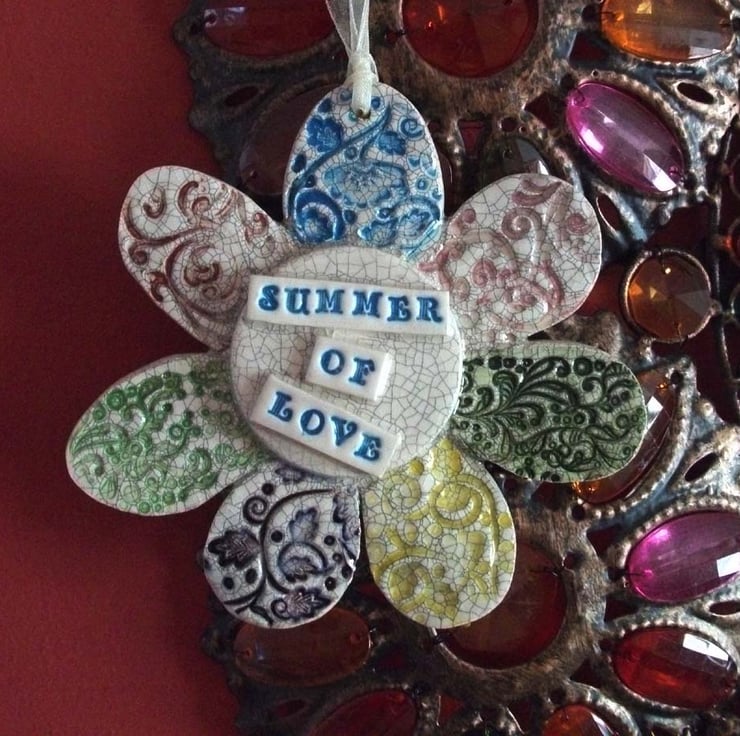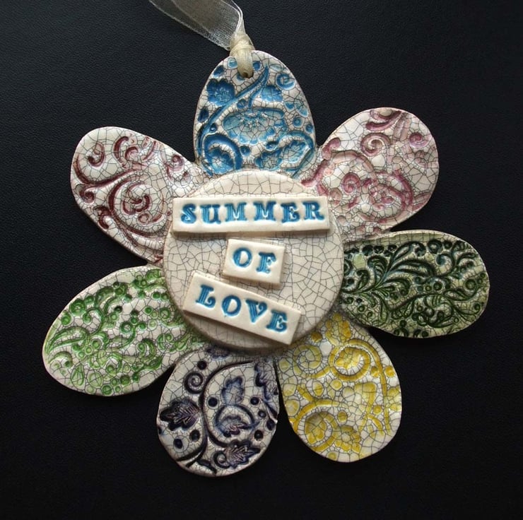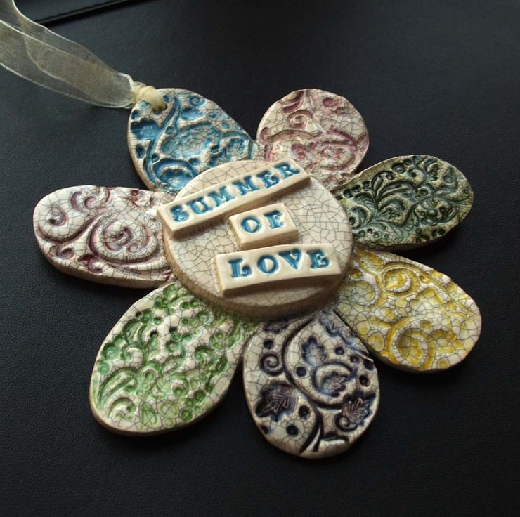 This ceramic flower decoration is made from white earthenware clay and each petal has been embossed with a different pattern and colour.