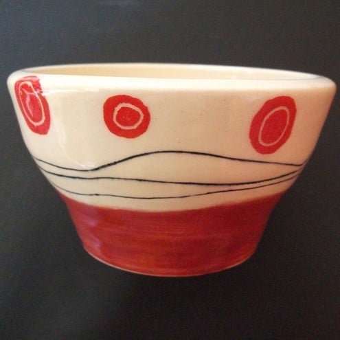 This set comprises of a small plate and bowl made from white earthenware clay and decorated with a red and black abstract pattern.