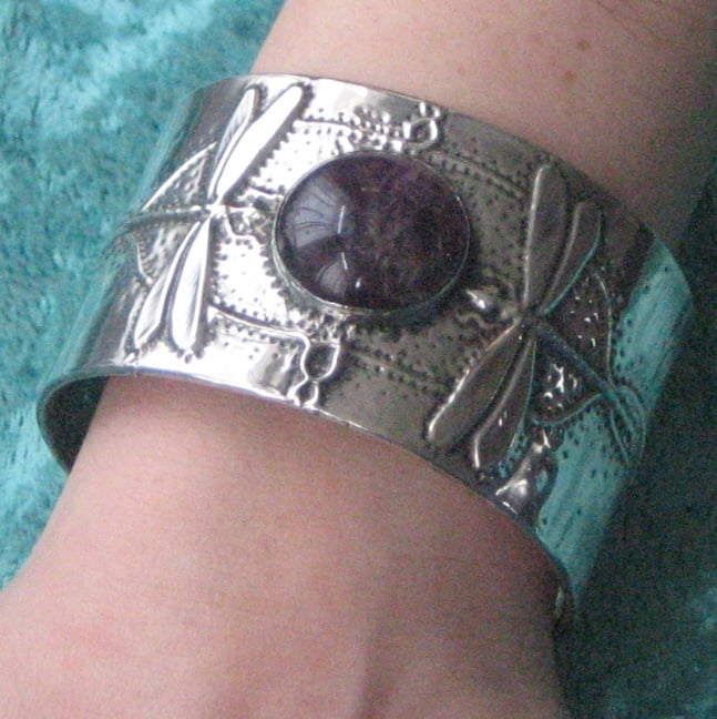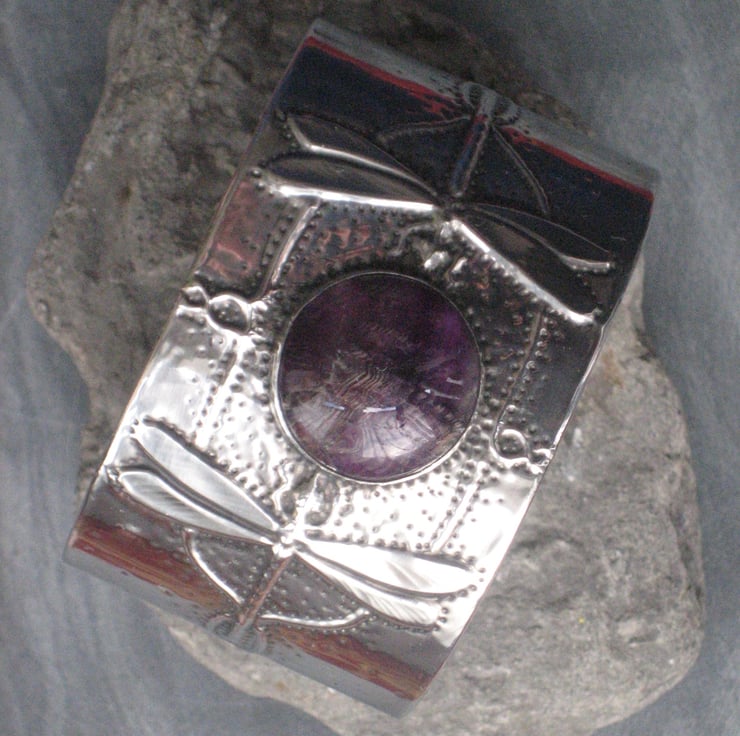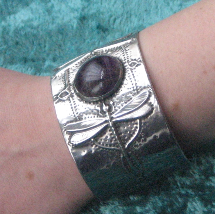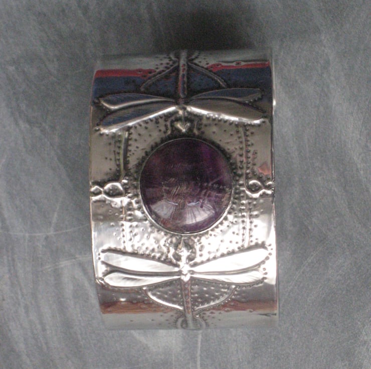 This stunning art nouveau style bracelet has been hand-made in shiny modern pewter, and features a lovely purple fluorite cabochon. The cuff is 38mm (1.5) deep,155mm (6.15) long. There is a space for putting the cuff on and off by sliding the hand in sideways. The cuff is slightly flexible,though flexing should be avoided where possible.
