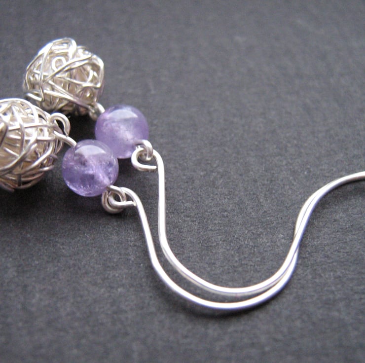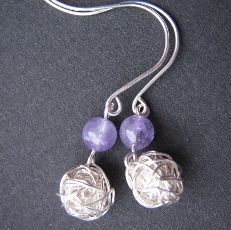 I used 0.4mm sterling silver wire to wrap a swarovski pearl bead and paired it with an amethyst bead to make these pretty drop earrings. I made all components including the ear wires, which are also sterling silver. They would look lovely paired with my amethyst bird nest pendant, also available in my shop, Lillibets.