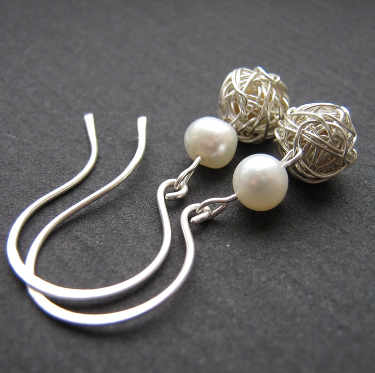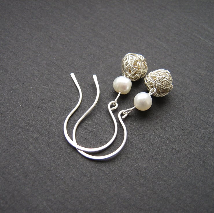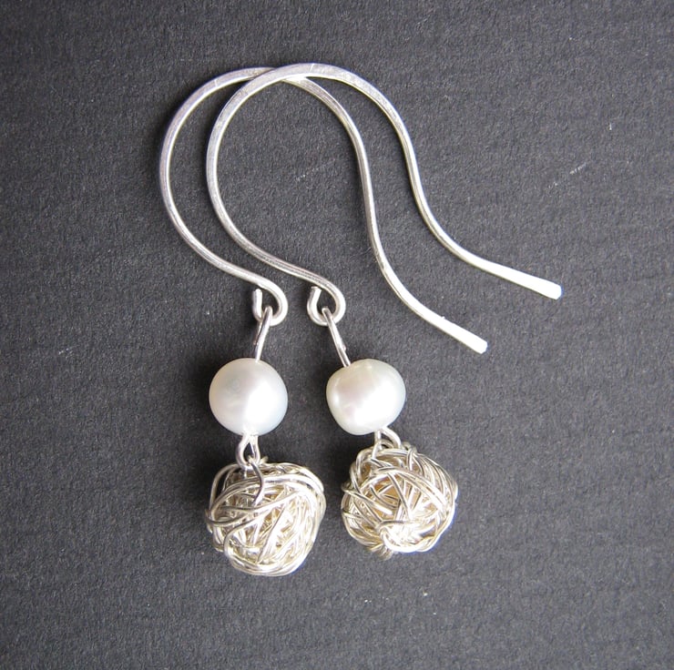 0.4mm sterling silver wire has been wrapped to form a bead, and paired with an ivory freshwater pearl to create these lovely drop earrings. I have a pair myself and wear them all the time. All metal parts are sterling silver, and have been handmade. They look lovely paired with my wire wrapped nest pendant.