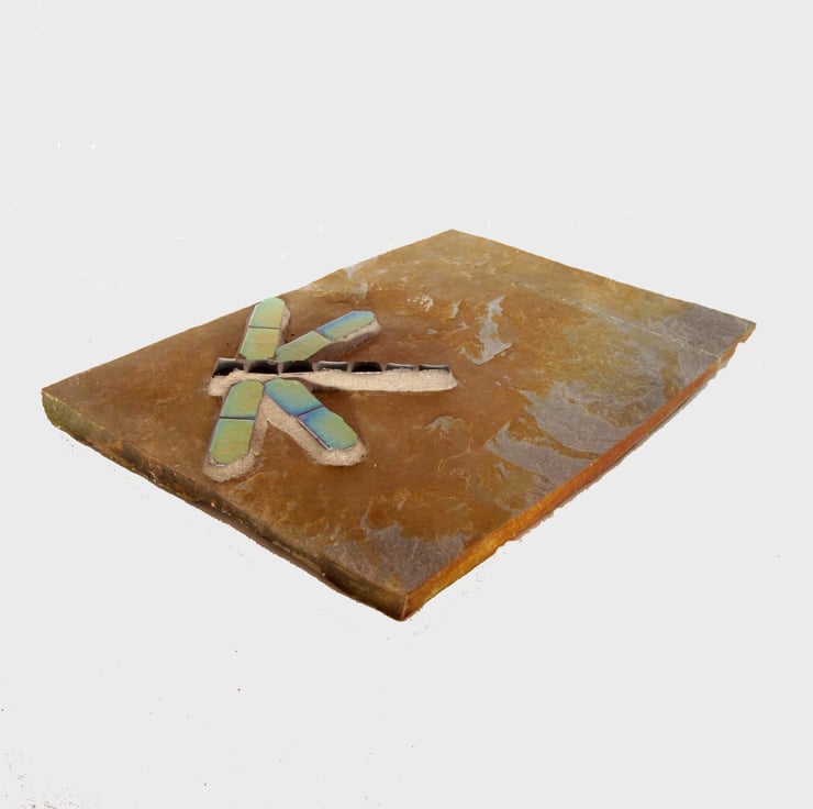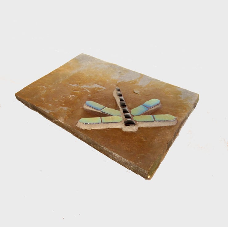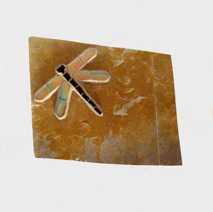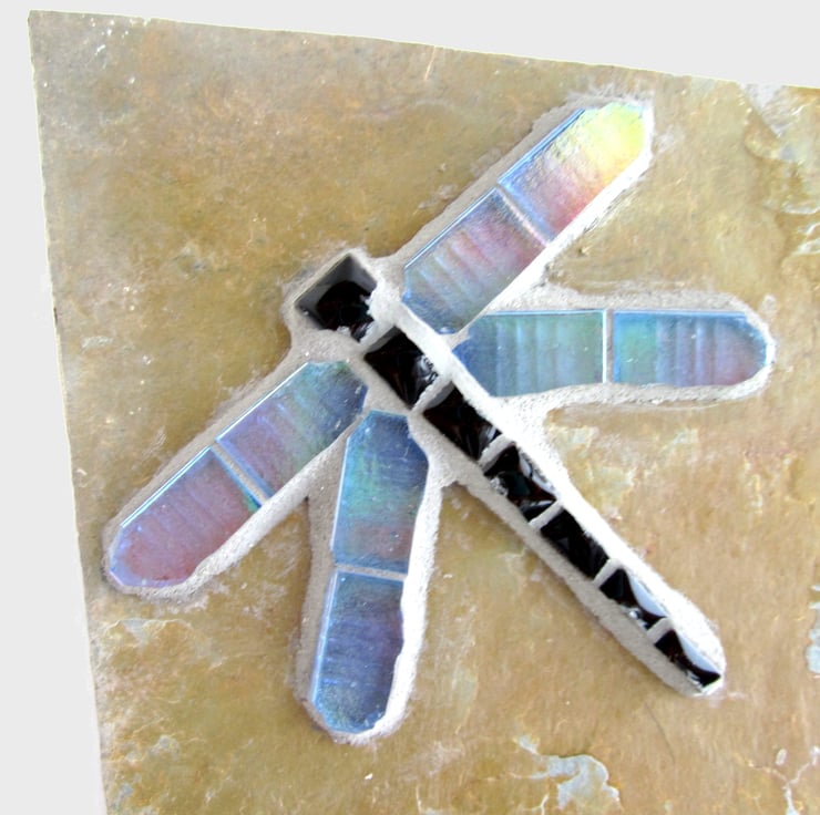 A mosaic dragonfly that has come to rest on a shard of slate. The dragonfly’s wings are transparent blue, but when the light angle changes they change to metallic iridescent. The top pair of wings have gold and magenta iridescence. The bottom pair shine gold, magenta, and electric blue.