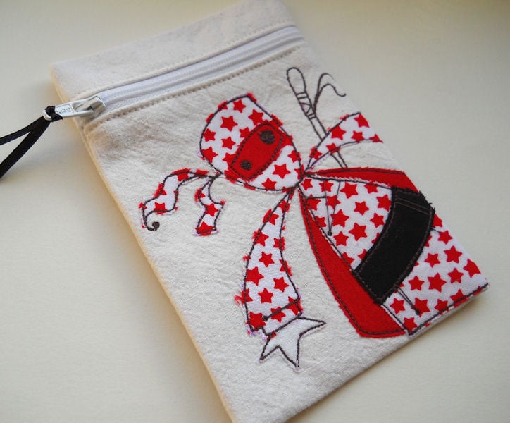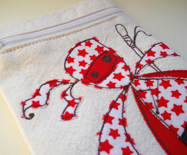 this appliqued and free motion embroidered gadget case is suitable for most smart phones, cameras, ipods etc, but would be equally useful as a little purse to store the bits and bobs that get lost in the bottom of your handbag.