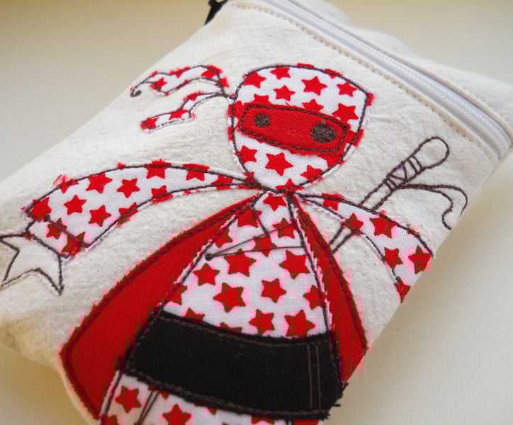 this not-so-sneaky ninja is in bright red & white cotton fabrics, which are layered and appliqued onto pre-washed calico, before i draw onto them with free machine embroidery. i then make them up into the finished item.