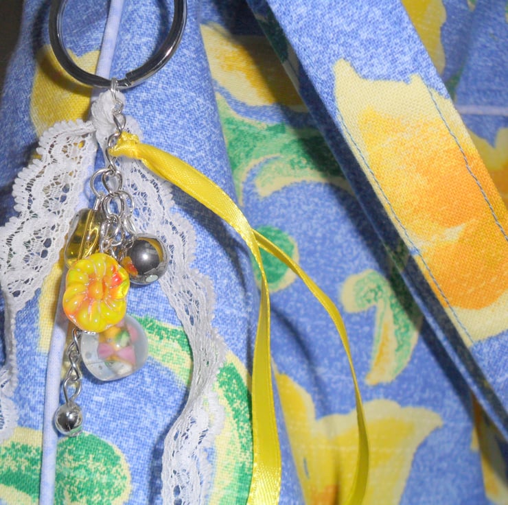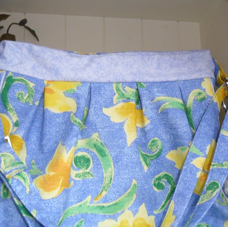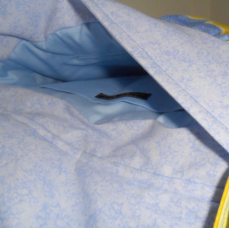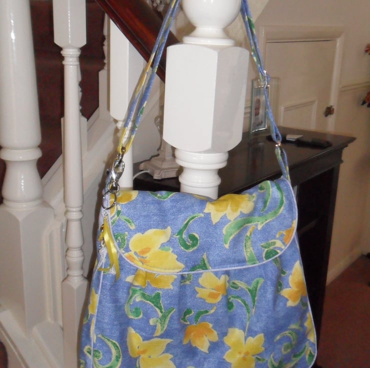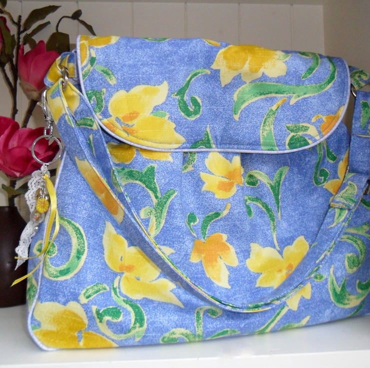 This bag is made in a lovely blue and yellow floral print cotton, gathered onto a contrasting blue cotton band. It is edged in blue piping and lined in blue cotton sateen. Inside there are two pockets; a divided slip pocktet and a zipped pocket. The flap closes with a magnetic snap and the strap is adjustable, allowing the bag to be worn across the body.