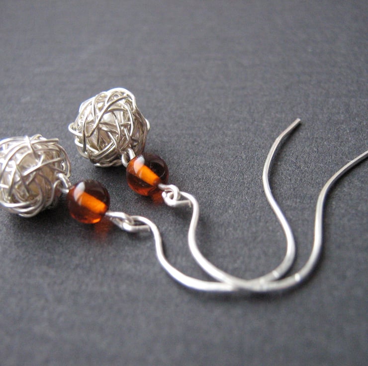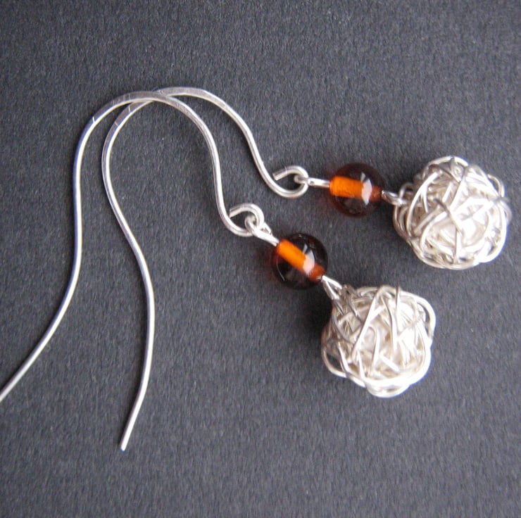 I use 0.4mm sterling silver wire to wrap a swarovski pearl bead and create these stunning beads, then add an amber bead and handmade sterling silver ear hook. They look lovely when they catch the light as you move.