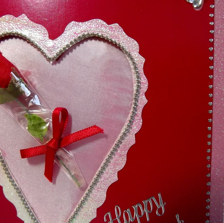 The heart has a fancy paper frame and is trimmed with silver ball chain, I have used silver dots to create the border around the red panel which has been layered onto a pink glitter card base.