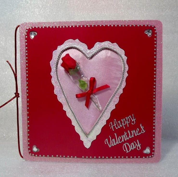 This card is approx 15cm (6") square, it features a padded pink heart with a single rosebud wrapped in cellophane.