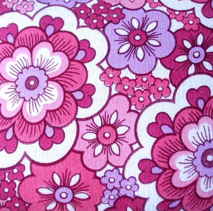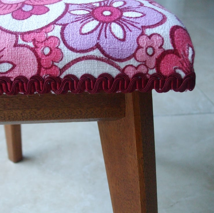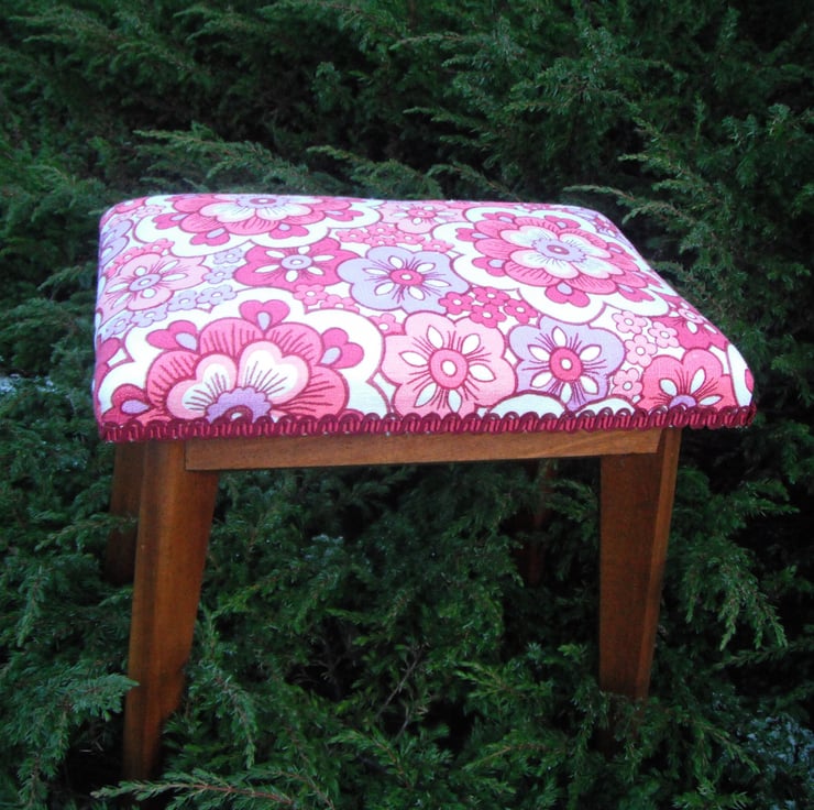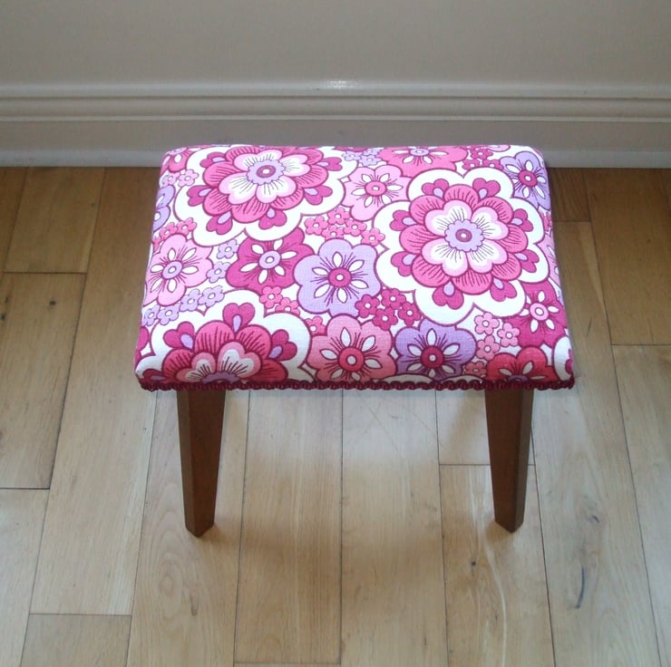 This is an original small retro stool that has been re-upholstered adding fresh fillings and finished with a bright vintage fabric dating probably from the 1970s. It will cheer up any girl's room. The fabric consists of flowers in vibrant pinks and purples in a white background. It is in very good condition considering it is a vintage piece of material, being made of cotton.