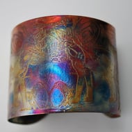 This etched copper bangle bearing imagery of birds in flight has been heat treated to create a vibrant multicoloured patina: this will deepen over time. I have developed a technique of literally 'painting' with a flame to manipulate the shape and direction of the colours. Although there is a degree of control, each piece is unique, as the colour patina cannot be replicated exactly.