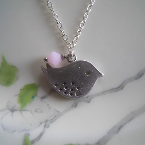 Gorgeous silver plated little birdie on a sterling silver chain. Such a cute little necklace just in time for spring. The chain is about 18 inches but can be made longer or shorter if preferred. It also has a little pink swarovski crystal bead along side the little bird. You can have the necklace with or without the little bead. This little birdie also comes in gold. See additional listing.