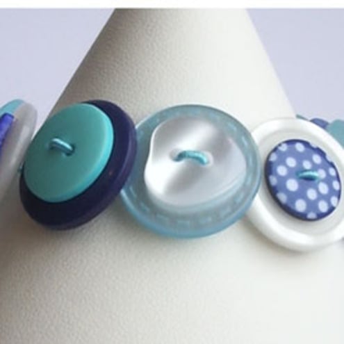 This distinctive button bracelet is rich with an assortment of blue, aqua, turquoise and pearlescent buttons. These are threaded onto jewellery wire, which secures at the end with a silver plated lobster clasp fastener.