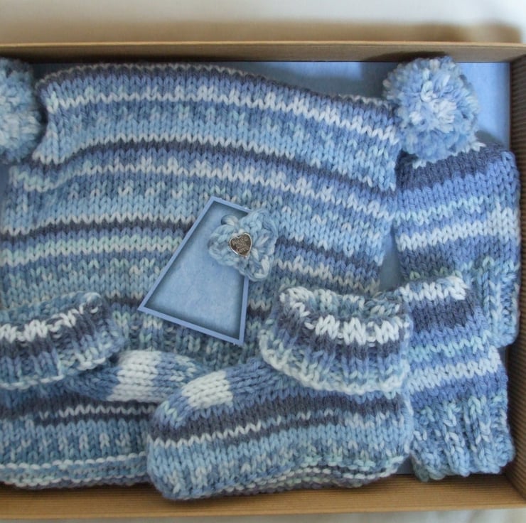 A smart trio of hand knitted accessories packaged in a gift box together with gift tag make an ideal present for the New Arrival.