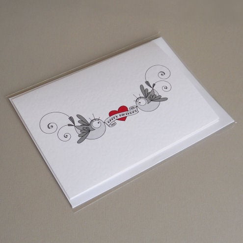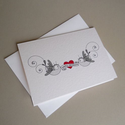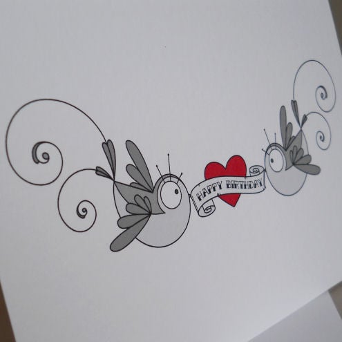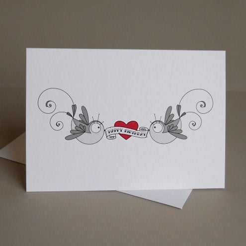 this quirky pair of swallows in the style of a retro tattoo design will make a great birthday card! coloured in shades of grey, with a contrasting deep red heart. the scroll reads "happy birthday".