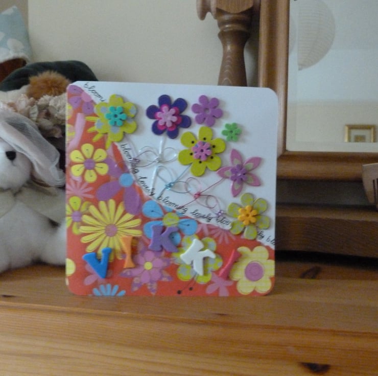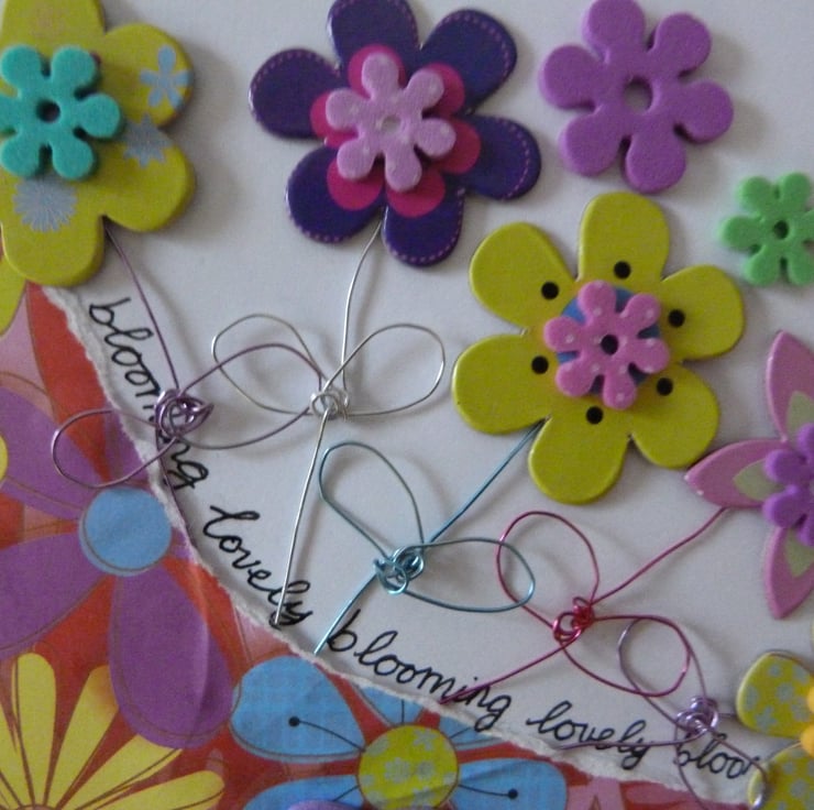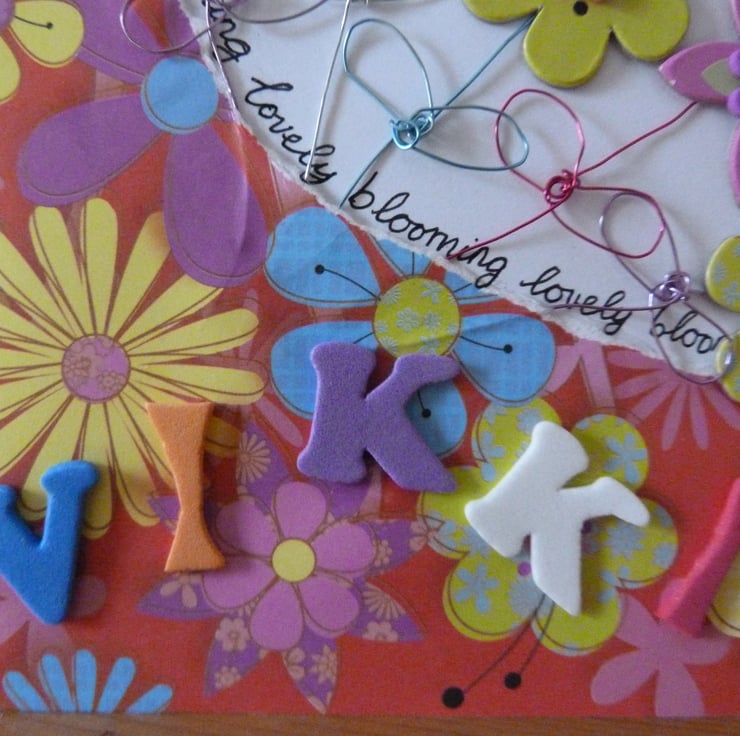 Bright and cheerful card made for maternity leave. Flowers made with wire stems and leaves and chipboard and funky foam flowers. Blooming Lovely hand drawn diagonally. Personalised name made from funky foam all mounted onto white card.
