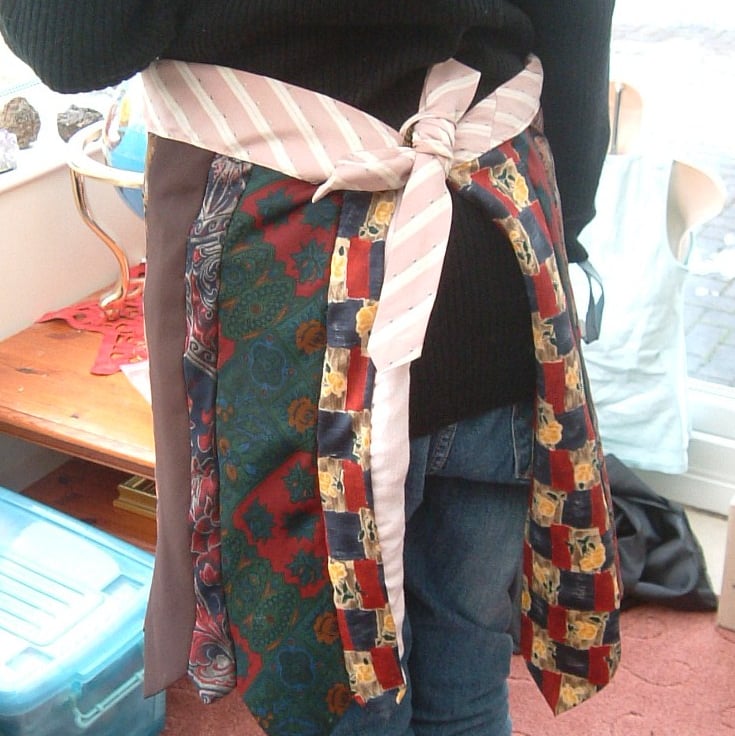 'Kiddies Tied to the Kitchen' is a fun and quirky half apron made from 9 Gent's neck ties! Totally unique and quite a talking piece and totally up-cycled, so very eco friendly too!
