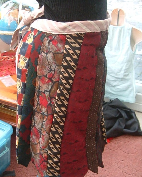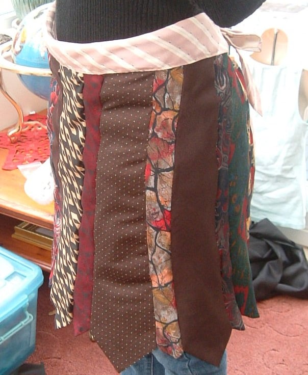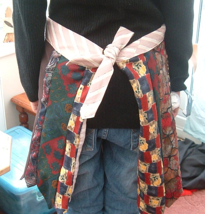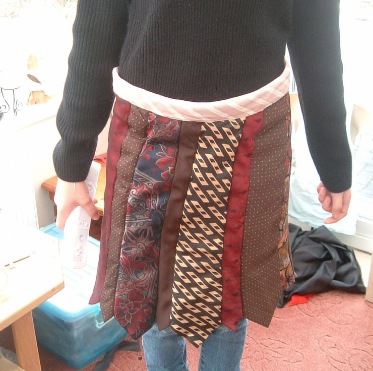 The Gent's neck ties have been cut and placed side by side, with the narrow ends in between, to form an elongated patchwork of coloured stripes, then hand sewn in colour matching cotton. The waist band has been made using one complete tie, simply so that your child can tie it around their waist. Approx Suitable for 8 to 14 years, although I can double knit it around my waist too.