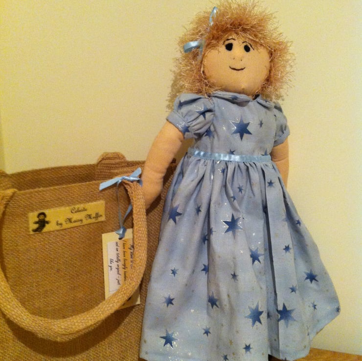 Celeste is a real cutie. She is wearing a long full skirted, puffed sleeved dress made from 100% cotton. The fabric is really pretty - pale blue with stars in a darker shade of blue and silver. Celeste has blue pants and socks and soft black shoes and is wearing a blue ribbon in her hair to match the sash on her dress. She has long blonde hair tied back in a bunch. Celeste is named on her back and comes in a jute carry bag, which is also decorated with her name. A lovely gift for a little girl. (Not suitable for under 3's because of small buttons.)