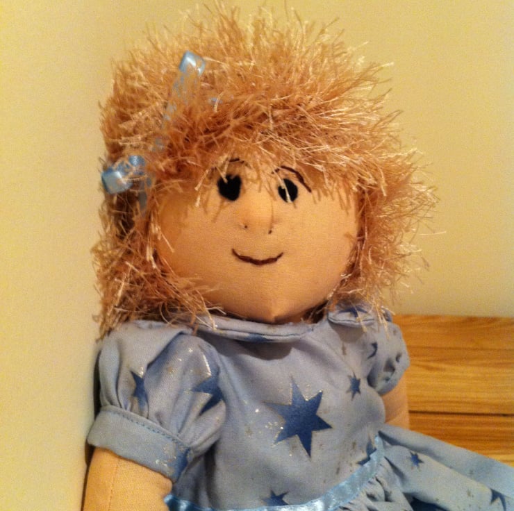 I loved the beautiful star fabric when I saw it and could picture a really cute doll with a long full skirted dress. The doll just had to have a 'night sky' sort of name so I decided to call her Celeste. She turned out just as I imagined. She is just so cute!