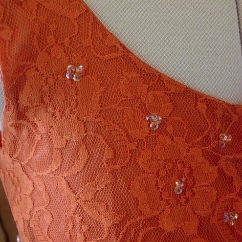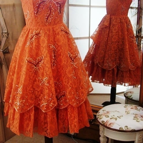 A delightful 1950's Style Custom beaded lace dress and very on trend for the new season! The bodice is fitted with a scoop neckline and beading with sequins on the front with small trios of sequins trimming the back of the scoop neckline.