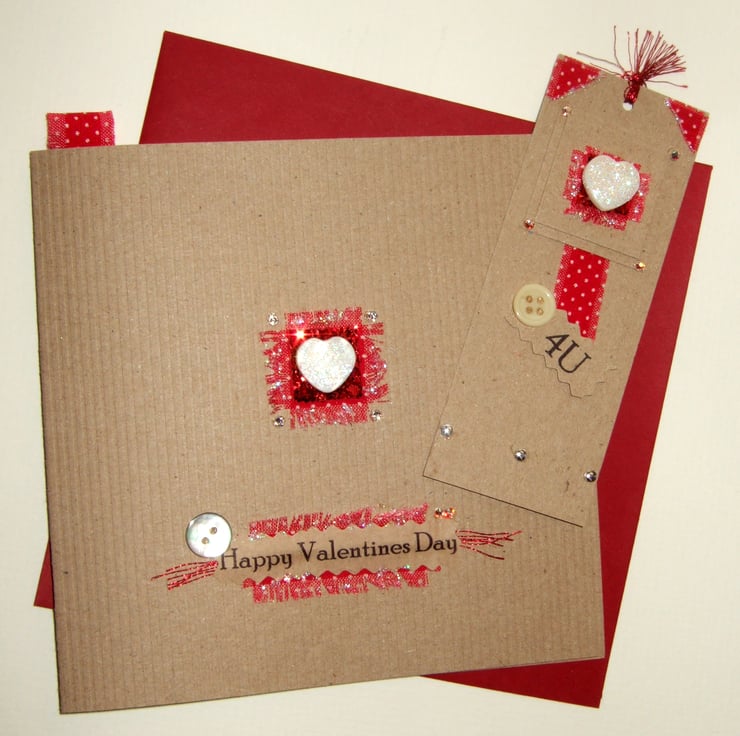 A tag saying, 'Happy Valentines Day' is on the front of the card and a small message tag is attached on the front of the bookmark saying, 'For You' or '4U'
