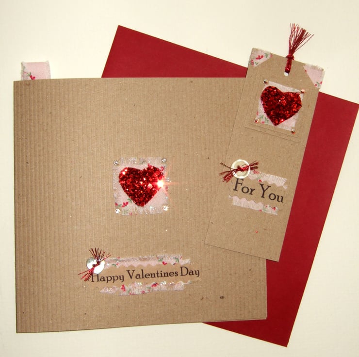 A tag saying, 'Happy Valentines Day' is on the front of the card and a small message tag is attached on the front of the bookmark saying, 'For You' or '4U'