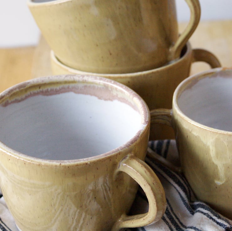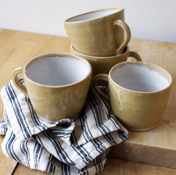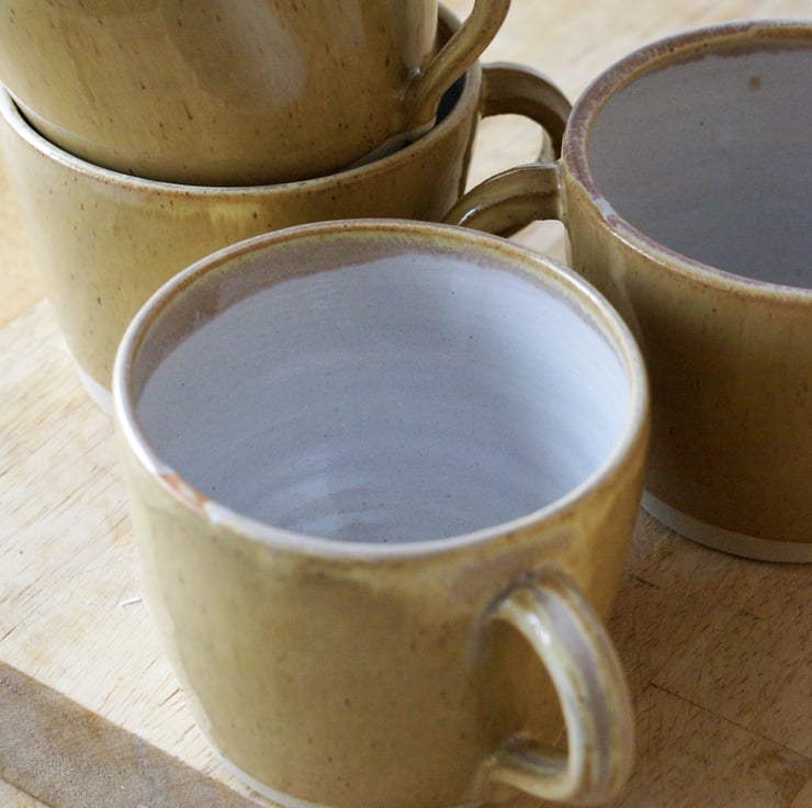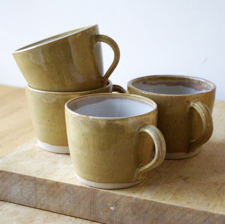 These four hand thrown mugs have been decorated in a speckled yellow pepper glaze and white inside making them easier to clean. Their gently fluted shape features a smooth finish which was created by skimming the surface to remove the throwing rings as it was being made.