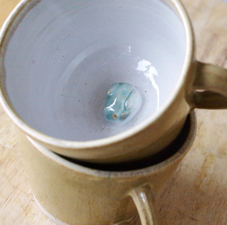 Each one features a small handmade frog in the bottom, a sturdy pulled handle to support the weight of the cup and a flat bottom hand to sit firmly on your table. Each mug has also been hand stamped with the Little Wren Pottery seal on the bottom to mark them out as handcrafted items.