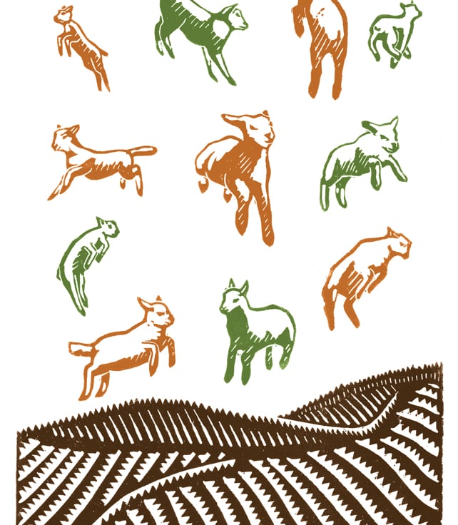 The image is of a gang of young lambs having a right old jump around on a hill, as they do in Spring. I had a more modest design for this a few years ago with a couple of lambs, but felt drawn to produce a more populated version!
