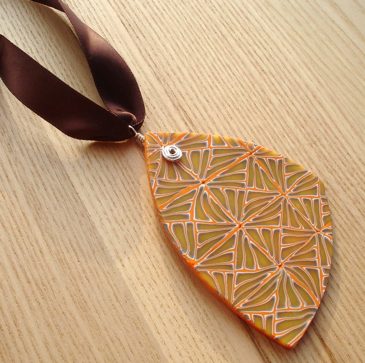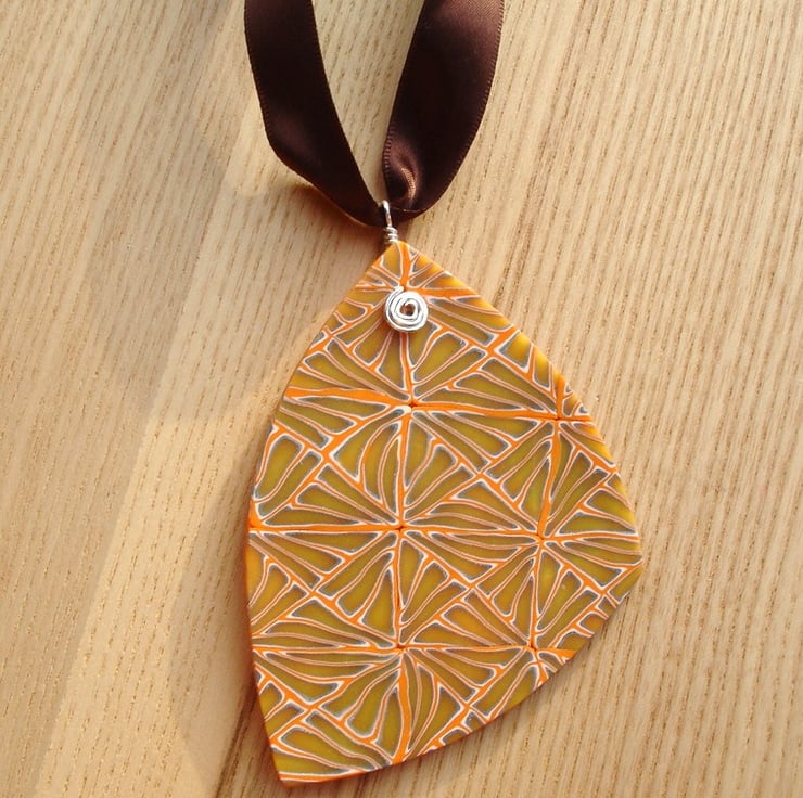 This funky pendant is big and bold and made from one of my own, one of a kind fimo canes, this one having an orange pattern which looks a little like giraffe print. It is lightly sanded and buffed to ensure it is smooth with a gentle sheen. It is fitted with a wire formed bail.